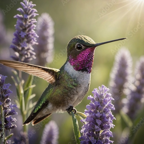 © Cavera, Obraz premium "A dreamy capture of an Anna's Hummingbird in a tranquil setting, surrounded by soft lavender blooms, with delicate sunbeams illuminating its vibrant colors."