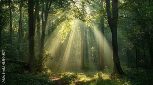 © Boonnam Burart, Fototapeta premium A dreamy forest scene with sun rays piercing through tall trees and dense green leaves