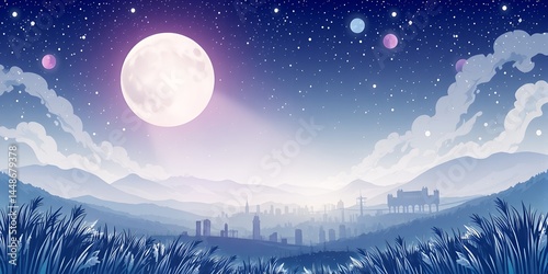 Fototapeta premium A dreamy landscape with a full moon, stars, clouds, mountains, and a distant...