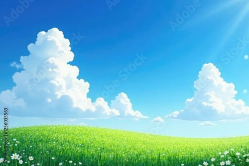 Obraz premium A dreamy landscape with soft, white clouds drifting across a bright blue sky,...
