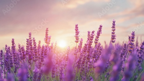 Naklejka premium A dreamy lavender field stretching into the distance, with purple blooms swaying gently under a pastel sunset sky