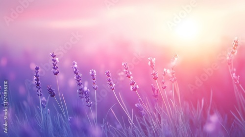 Naklejka premium A dreamy lavender field stretching to the horizon, kissed by the soft glow of...