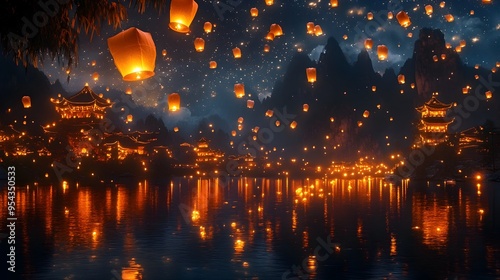 © Heng Heng - AI Stock, Obraz premium A dreamy night in the year 2050 where traditional lanterns hover and change shapes as they float effortlessly into a sky filled with twinkling stars blending timeless elements with a futuristic