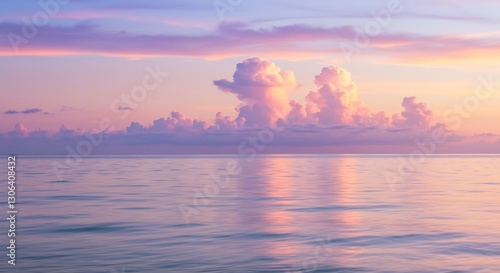 Naklejka premium A dreamy pastel sunset over a calm ocean with soft waves and glowing clouds