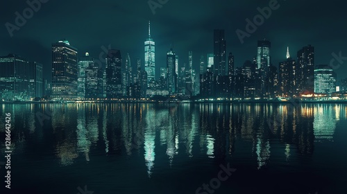 Fototapeta premium A dreamy reflection of a city skyline on calm water at night.