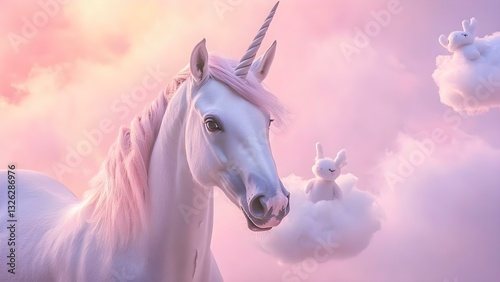 Fototapeta premium A dreamy scene featuring a white unicorn with a pink mane, surrounded by...