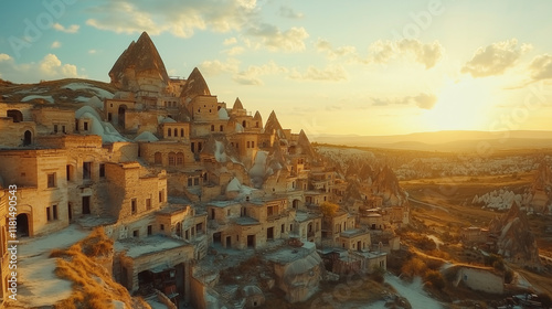Fototapeta premium A dreamy scene of Cappadocia lit by the golden hour, with complex patterns of...