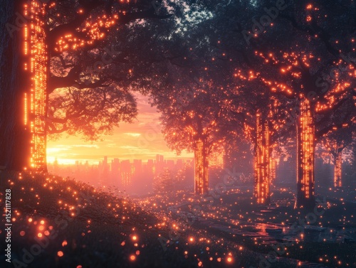 Naklejka premium A Dreamy Twilight: Cityscape Glimpsed Through Luminous Trees, a Magical...
