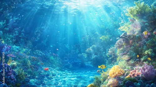 Fototapeta premium A dreamy underwater scene with vibrant coral reefs, tropical fish, and sunbeams piercing through the clear blue water for a captivating wallpaper.