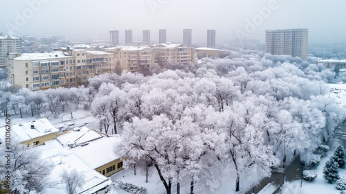 © Elmin, Obraz premium A drone captured a beautiful scene in Baku: evergreen trees covered in snow after a strong winter storm.