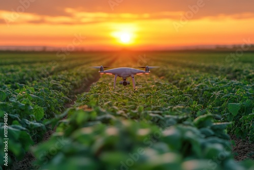 Obraz premium A drone flies over a field of green crops at sunset.