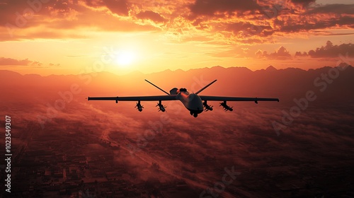 Fototapeta premium A drone flying over a landscape during sunset, showcasing its silhouette...