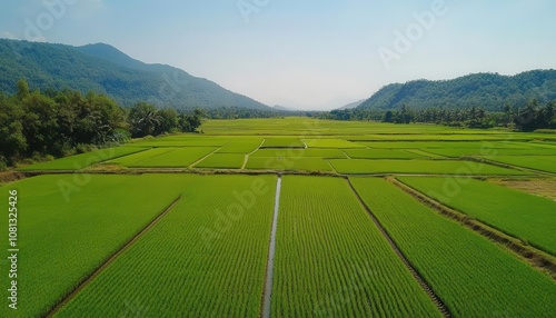 © Nawarit, Fototapeta premium A drone view of a large rice paddy field, Rice Farming, Vast and organized