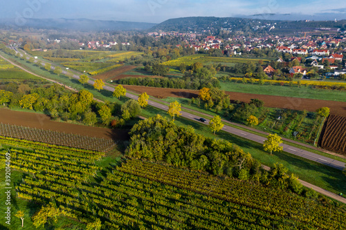 Fototapeta premium A drone view of the stunning expanse of the Vosges foothills. Autumn vineyards in the morning fog.