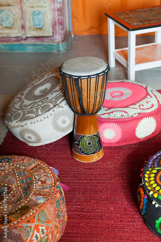 © Светлана Винокурова, Fototapeta premium a drum and many colored Ottomans lie on the floor of the meditation room. relax.