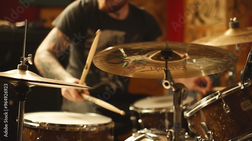 Naklejka premium A drummer plays a cymbal in a close up shot.