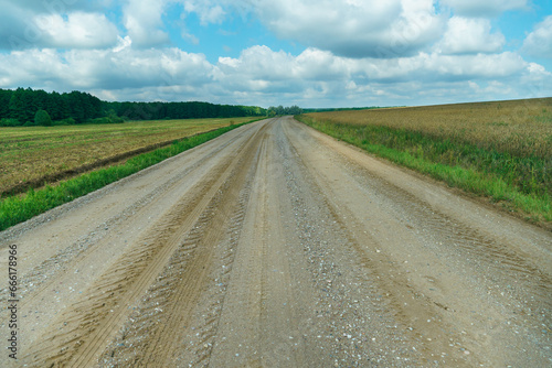 © Pokoman, Naklejka premium A dry sandy road passes through a field under the scorching sun and clouds. Dirt road outside the city in the village. Arid climate on earth. Climate change and its consequences.