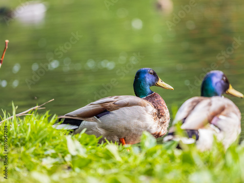Fototapeta premium A duck stands on its paws with a blurred background.