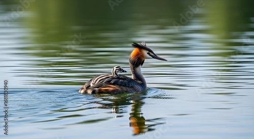 © Faizi, Fototapeta premium A duck swims in calm water with greenery blurred in the background. Duck has brown patch on neck. Serene atmosphere. AI Generated