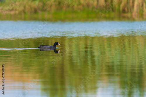 Fototapeta premium A duck swims in the lake. Photographed from a distance.