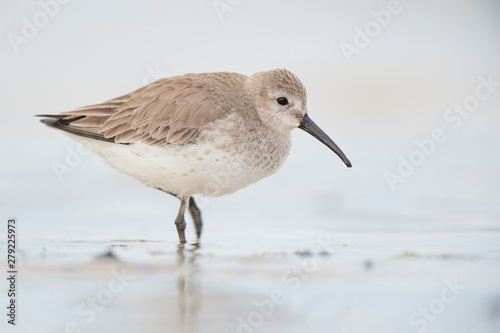 © rayhennessy, Obraz premium A Dunlin stands in shallow water and wet sand in soft light with a smooth background.