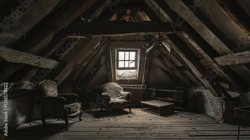 © Galib, Obraz premium A dusty attic with an old chair covered in cobwebs.
