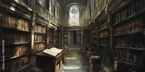 Fototapeta premium A dusty, old library with bookcases and an open book.