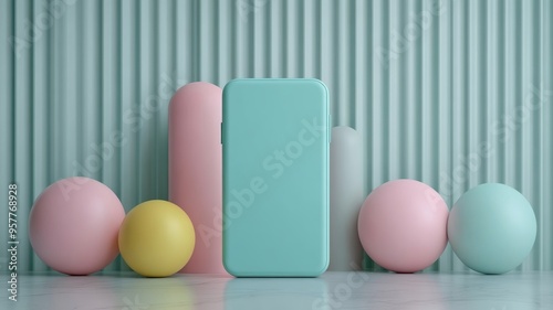 Fototapeta premium A dynamic abstract arrangement featuring pastel-hued spheres and cubes,...