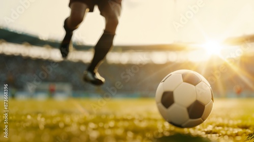 Fototapeta premium A dynamic action shot of a professional soccer player in midair about to kick...