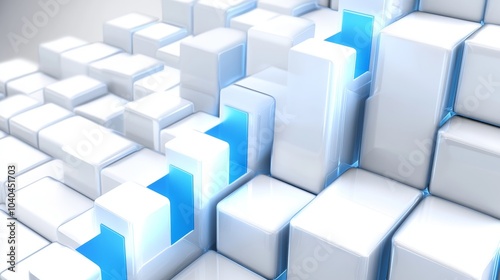 Fototapeta premium A dynamic arrangement of white cubes with blue light accents, representing...