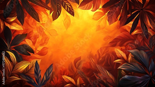 © ThuyTrang, Fototapeta premium A dynamic border of overlapping tropical leaves, glowing softly with sunset tones of orange and yellow, intricate details highlighted by warm light, central area left open for text, lush and inviting,
