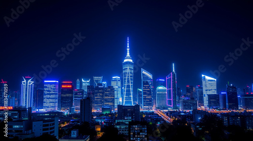 © Abdul, Fototapeta premium a dynamic cityscape background at night, showcasing a skyline illuminated by vibrant neon lights in shades of blue and green, capturing the essence of urban life and energy."