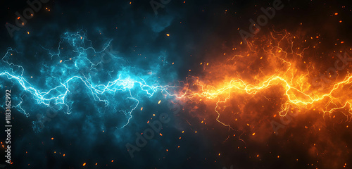 Fototapeta premium A dynamic clash of vibrant blue and orange lightning bolts against a dark...