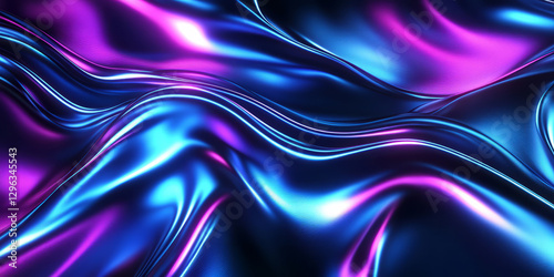 Fototapeta premium A dynamic 3D abstract background featuring a wave of metallic energy, glowing with pulsating neon blue and purple light. The seamless transitions and reflective surfaces enhance the futuristic appeal.