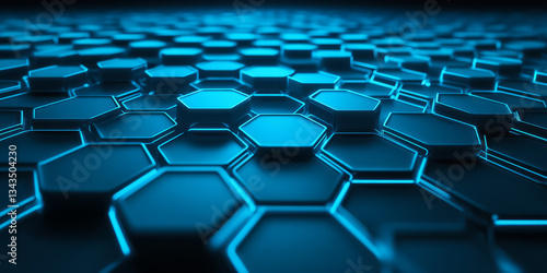 © Volodymyr, Naklejka premium A dynamic 3D background showcasing a tunnel of glowing hexagons stretching into infinity. Each hexagonal tile emits a soft blue light, forming an immersive and futuristic sci-fi corridor reminiscent