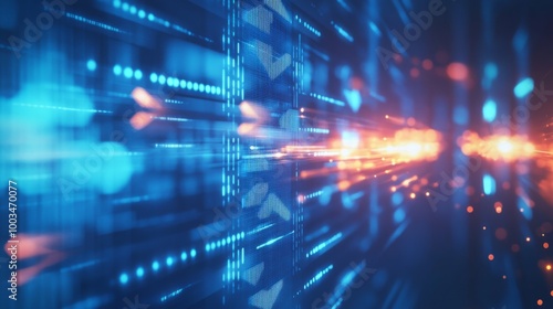 Fototapeta premium A dynamic digital landscape featuring vibrant blue and orange lights, symbolizing speed, technology, and data flow.
