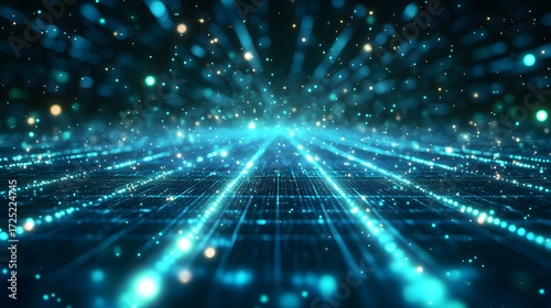 Naklejka premium A dynamic digital landscape, illuminated by vibrant turquoise light streams,...
