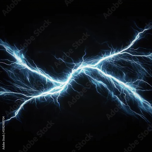 © Wimon, Obraz premium A dynamic display of electric blue lightning bolts crossing against a dark background, creating a visually striking and energetic effect.