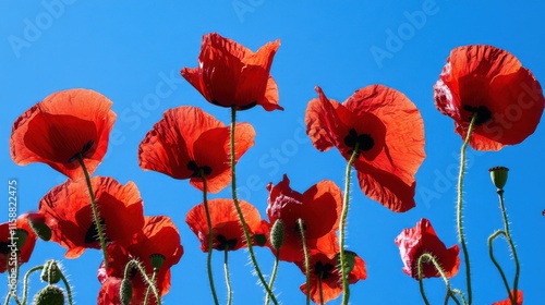 Obraz premium A dynamic display of red poppies against a clear blue sky, angled shot,...