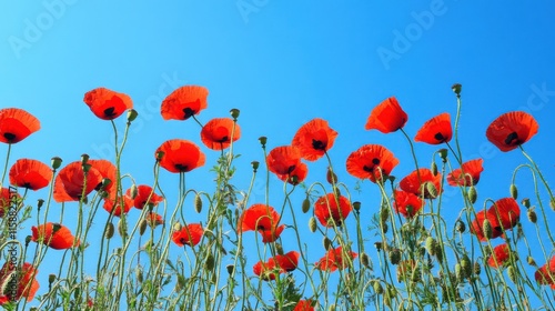 Obraz premium A dynamic display of red poppies against a clear blue sky, angled shot,...
