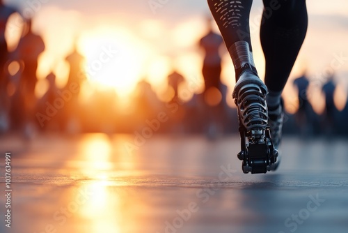 Fototapeta premium A dynamic evening scene featuring a close-up of a prosthetic running blade as an athlete runs towards a vibrant sunset, capturing motion and determination against the horizon.