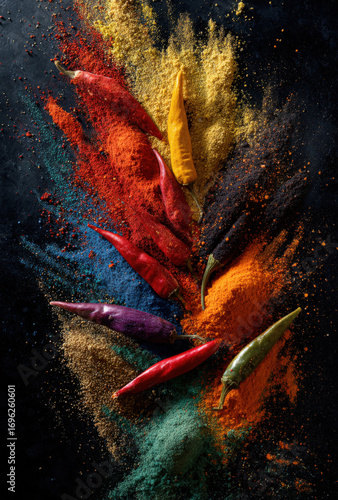 © MONWARA, Naklejka premium a dynamic explosion of colorful spices, with chili peppers and black cumin powder suspended in the air against a dark background
