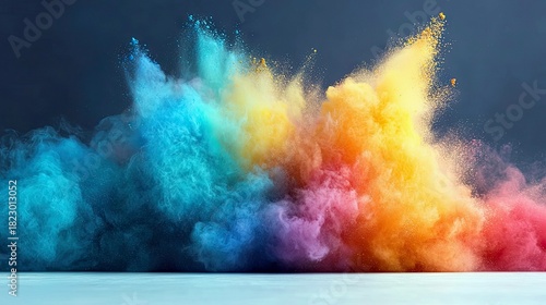 © Melati, Obraz premium A dynamic explosion of vibrant colored powder, with hues of blue, green, yellow, orange, and pink, against a dark background.