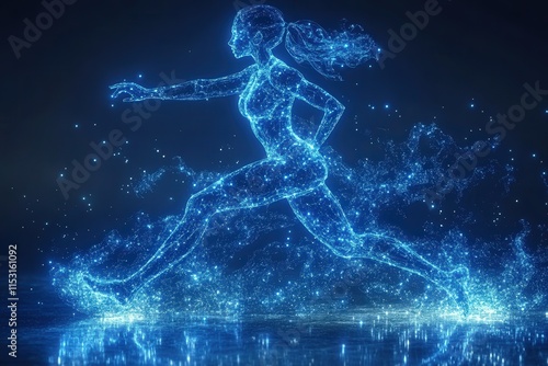 Fototapeta premium A dynamic female figure made of glowing particles, running energetically across a digital landscape, showcasing an ethereal blue light effect.