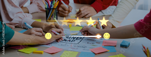 Obraz premium A dynamic group of individuals engages in a collaborative mind mapping session, using colorful sticky notes and pens to share and develop creative ideas for projects. Trope
