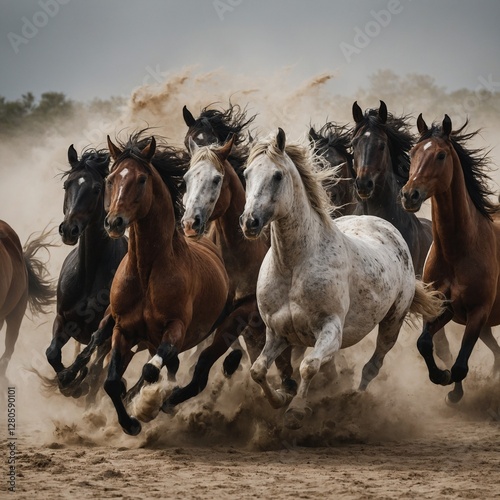 Fototapeta premium "A dynamic herd of majestic horses galloping through a fierce sandstorm,...