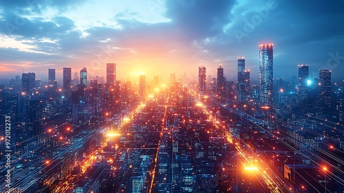Fototapeta premium A dynamic, high-tech city glowing with pulsing light from communication hubs...