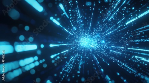 © Danudet.C, Naklejka premium A dynamic holographic background with blue light beams and digital particles, evoking a modern technology and futuristic atmosphere.