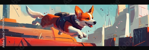 Naklejka premium A dynamic illustration of a corgi leaping over obstacles in a vibrant urban...