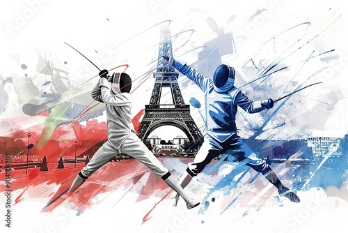 © STF Design , Obraz premium A dynamic illustration of two fencers fencing in front of the Eiffel Tower, with a red and blue color palette. A detailed ink sketch with splashes of paint in the style of Robby. white Background